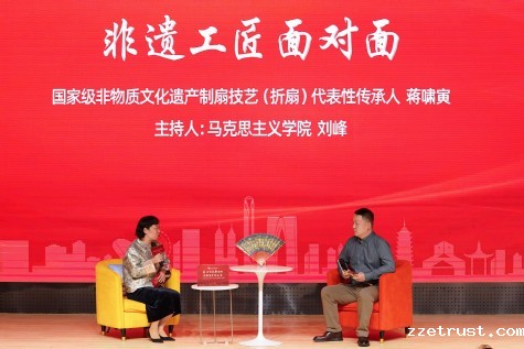 随后,我校马克思主义学院刘峰老师与国家级非物质文化遗产制扇技艺代表性传承人蒋啸寅一同带来了一场互动访谈。蒋老师通过讲解折扇技艺,分享学艺之路和创作之路,生动传递新时代工匠精神,学技艺靠的是一丝不苟的精益求精的精神,靠的是持之以恒的刻苦钻研的精神,靠的是坚守初心的开拓创新的精神。在提问环节,他还勉励同学们,从初识、学习到最终精通某一门技艺,要围绕“热情、坚持、初心”这三个关键词,励志拼搏、刻苦勤学,在不断创新中绽放技艺光芒。