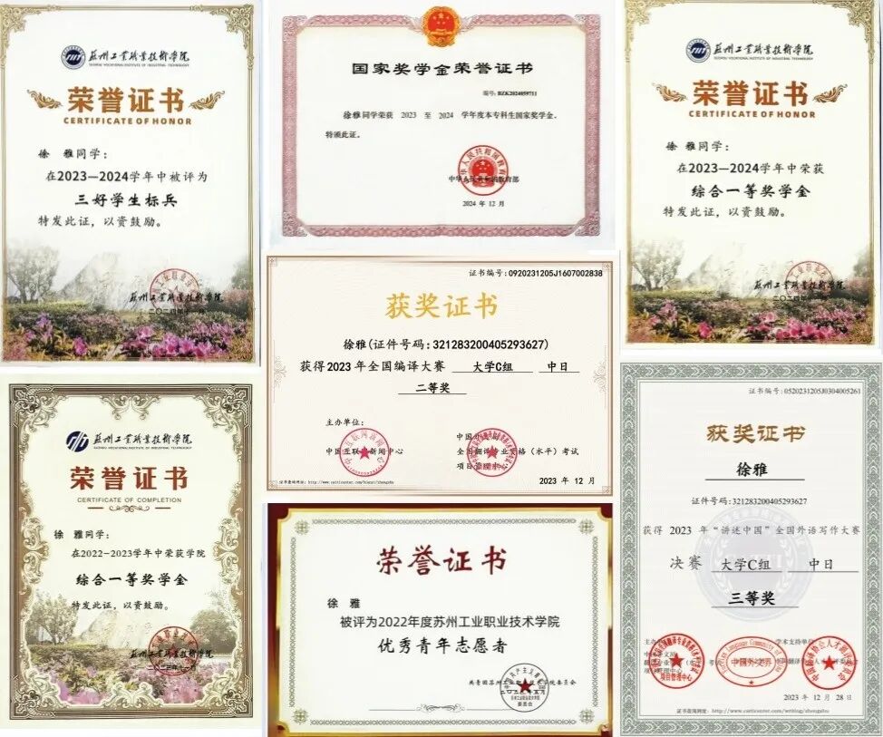 学海无涯,绽放青春。她学业成绩名列前茅,获得国家奖学金,获评校“三好学生”“优秀学生干部”等称号,累计获得国家级荣誉3项、省级荣誉8项、校级荣誉18项。